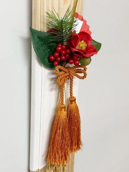 杉板に、華やかな紅白の扇や椿、稲穂、松などをあしらい