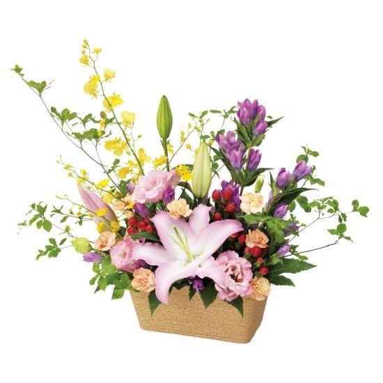 堂々たる花姿のユリに、生き生きとしたリンドウとオンシジウムをあわせた豪華なアレンジメントです。