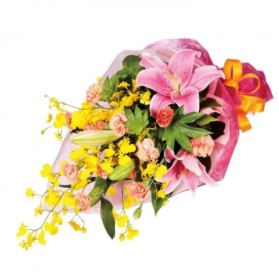 凛としたユリを中心に、ピンク色のラッピングとオレンジのリボンでまとめました。