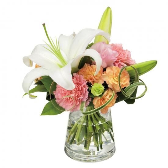 動きのあるグリーンが印象的な花束には、華やかな白いユリと暖かな色合いの花々を合わせ
