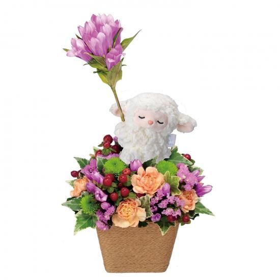 花キューピットで人気のマスコット付きアレンジメントは、女性やお子様へのプレゼントにぴったりです。