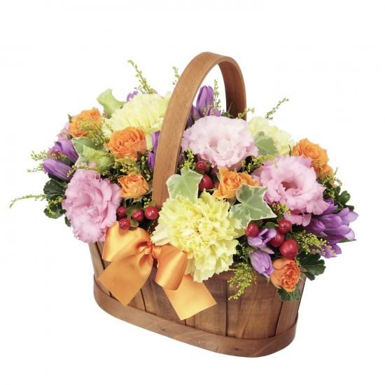 ピンク、イエロー、オレンジの花々にリンドウをあわせて、ボリュームたっぷりなバスケットアレンジメントに仕上げました。