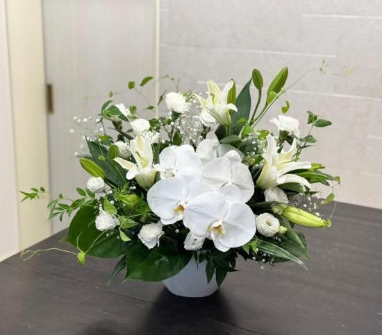 洋花で清楚にまとめたアレンジメントです。故人を偲ぶだけでなく清らかな空間を整えます。