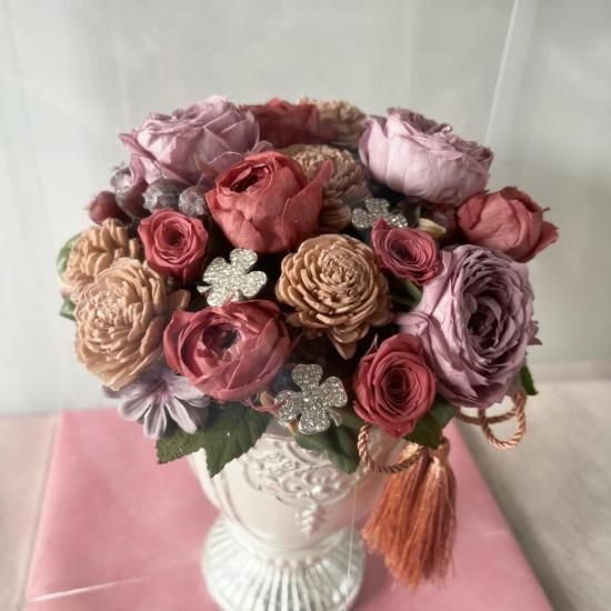 白いアンティーク調の花器に可愛らしいタッセルが添えられクラシックな気品と遊び心が両立。ギフトにおすすめです。