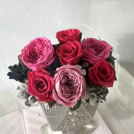 周囲のシルバーやパールのアクセントが全体を引き締め、華やかさの中に洗練された印象をプラス。