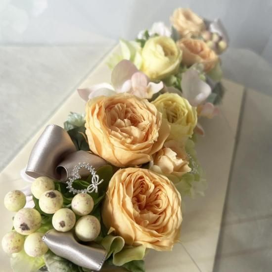 柔らかなオレンジとイエローのバラが並び、陽だまりのような明るさと優しさを放ちます。